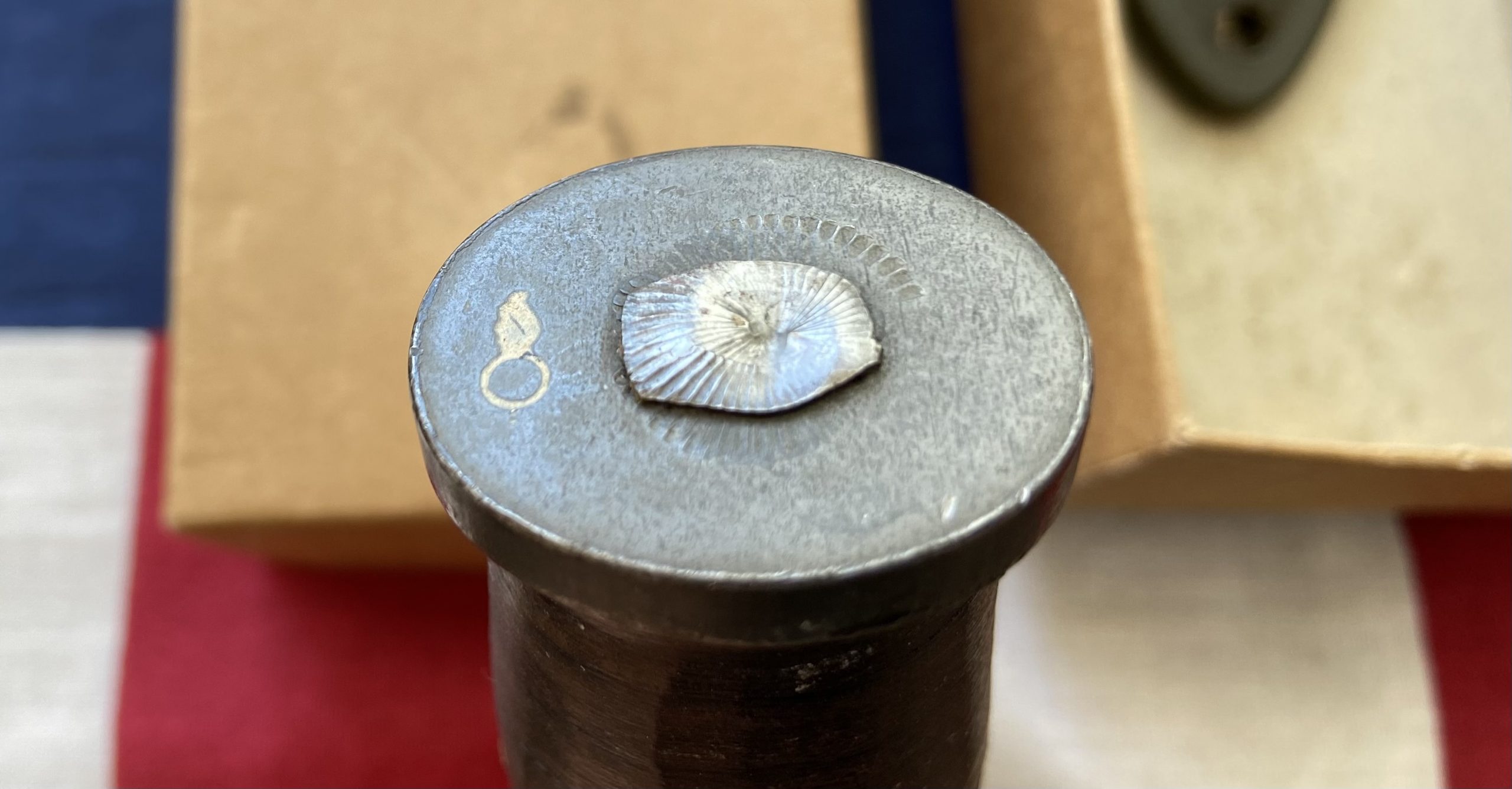 Détail du pommeau avec sa “Flaming bomb” et sa soie matée sur l’Utica “Boxed” (Collection personnelle)